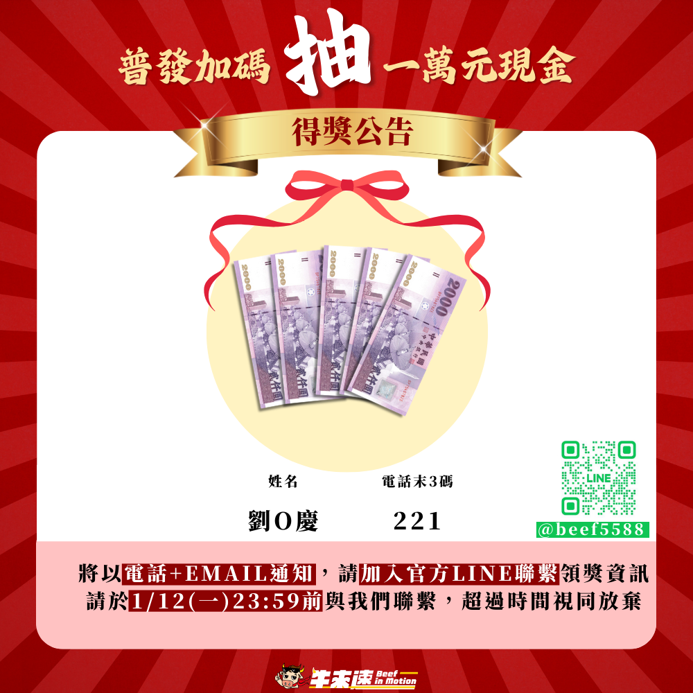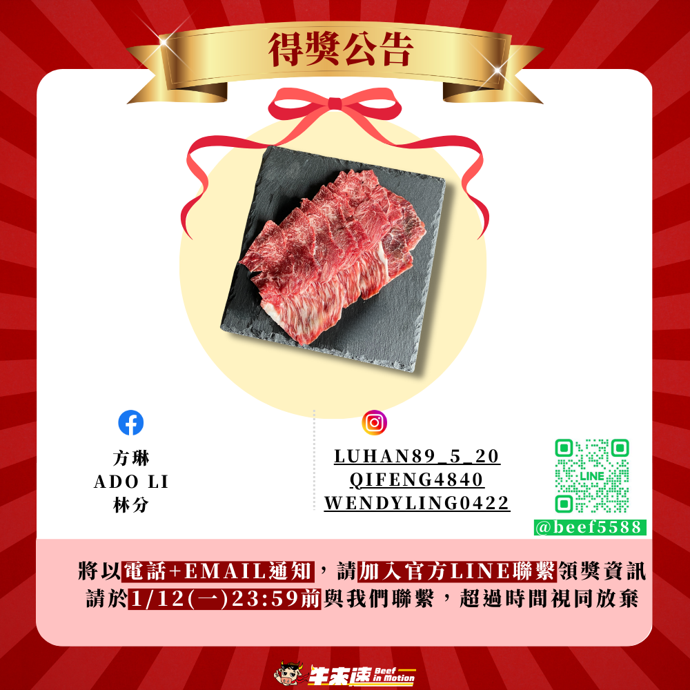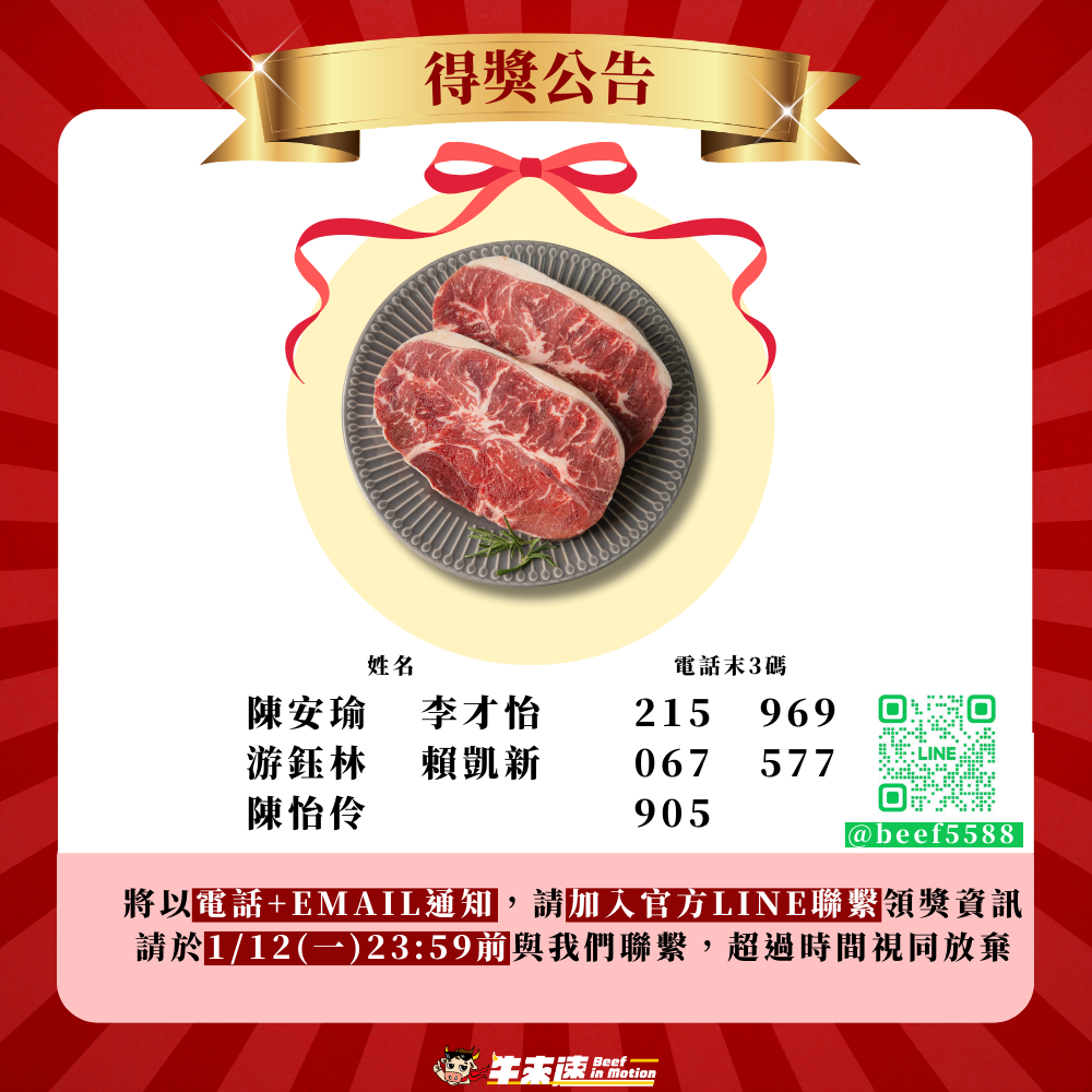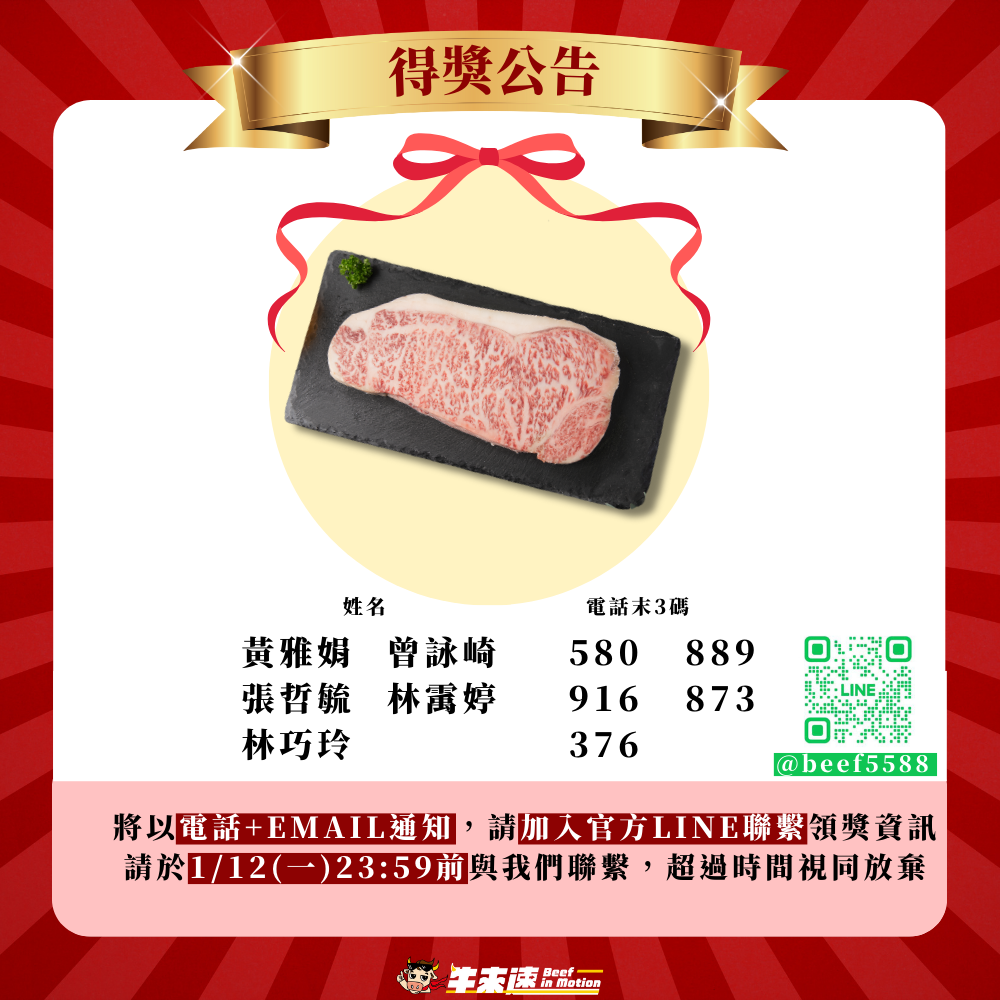 2.主動聯繫: 請得獎者於 1/12 23:59 前,主動私訊我們的 官方 LINE (@beef5588),超過時間視同放棄。